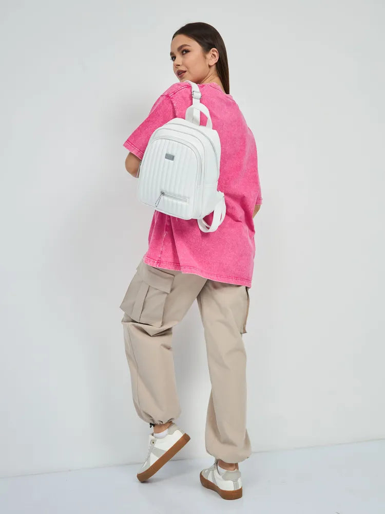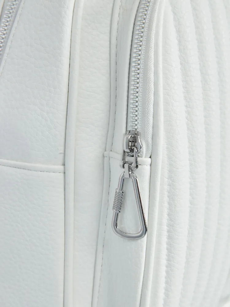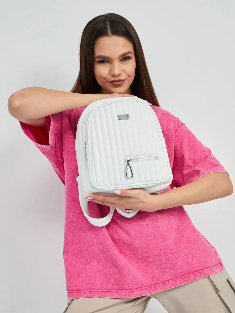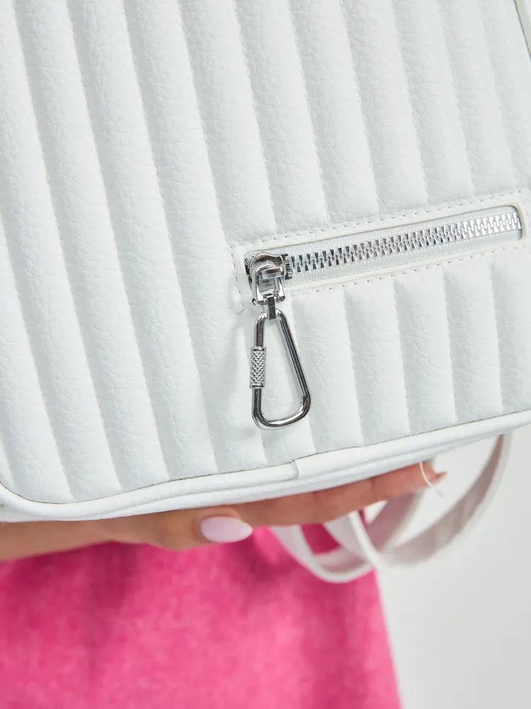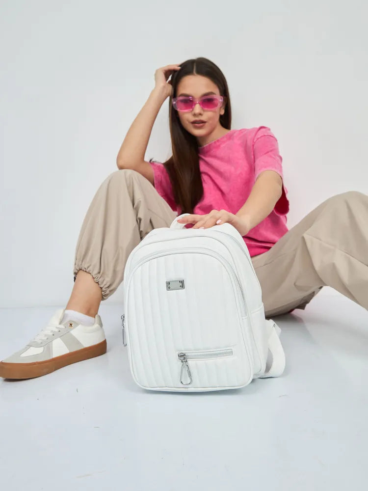 Opgrader din accessory-kollektion med denne chikke og urbane rygsæk i en frisk struktureret hvid nuance. Denne rygsæk kombinerer funktionalitet med et stilfuldt udseende, og er fremstillet af holdbart materiale med fine tekstur detaljer. Med en kompakt, men rummelig konstruktion, inkluderer den flere lommer med lynlås, som sikrer dine ejendele og holder dig organiseret på farten. Justerbare skulderstropper tilbyder komfortabel bærbarhed, hvilket gør den til en ideel ledsager for daglige eventyr eller weekendudflugter.