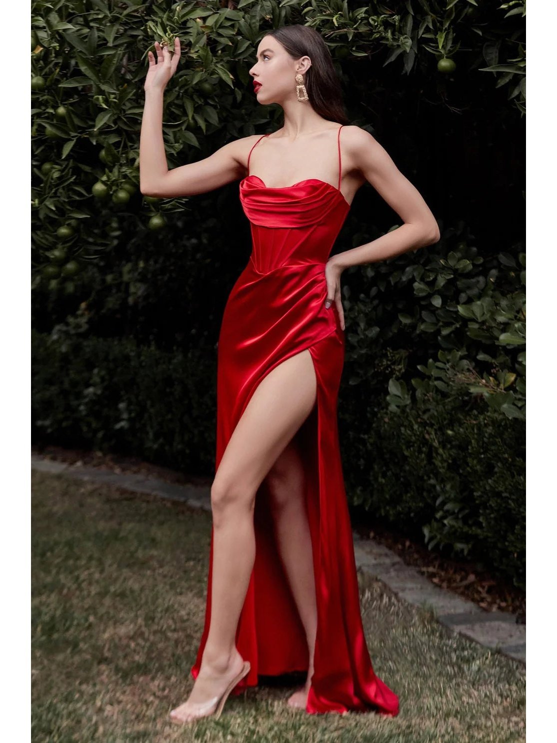 Denne kjole udstråler sofistikering med sit silkeagtige stof og dristige høje slids. Det detaljerede bånd i taljen fremhæver din silhuet, mens den diskrete skinnende finish giver et luksuriøst touch til enhver formel lejlighed.