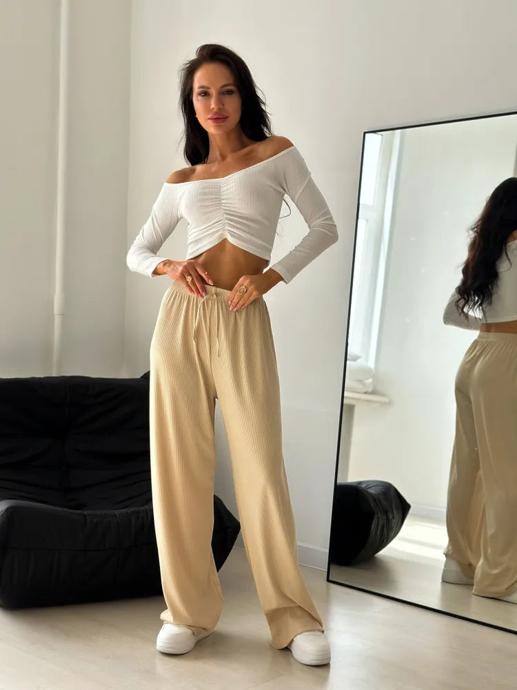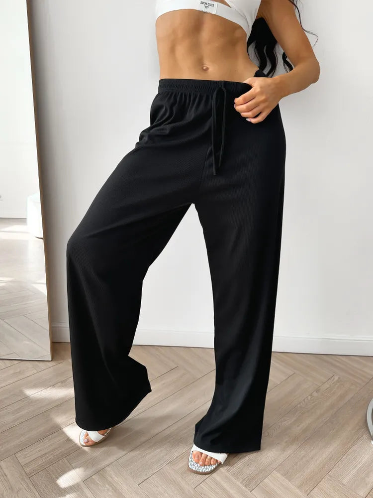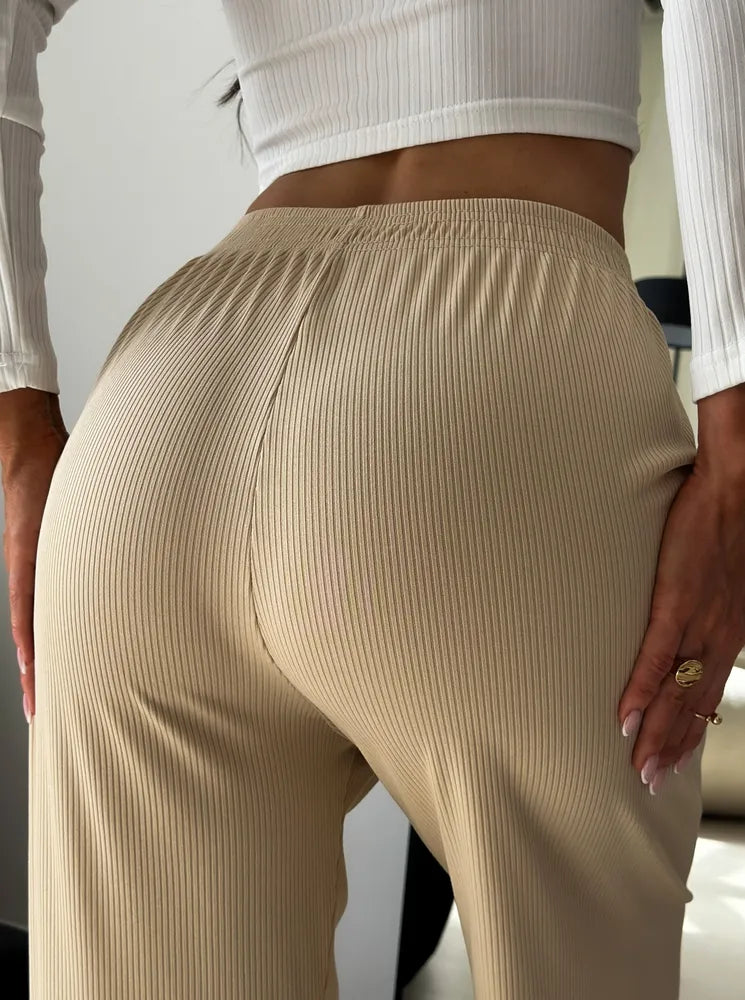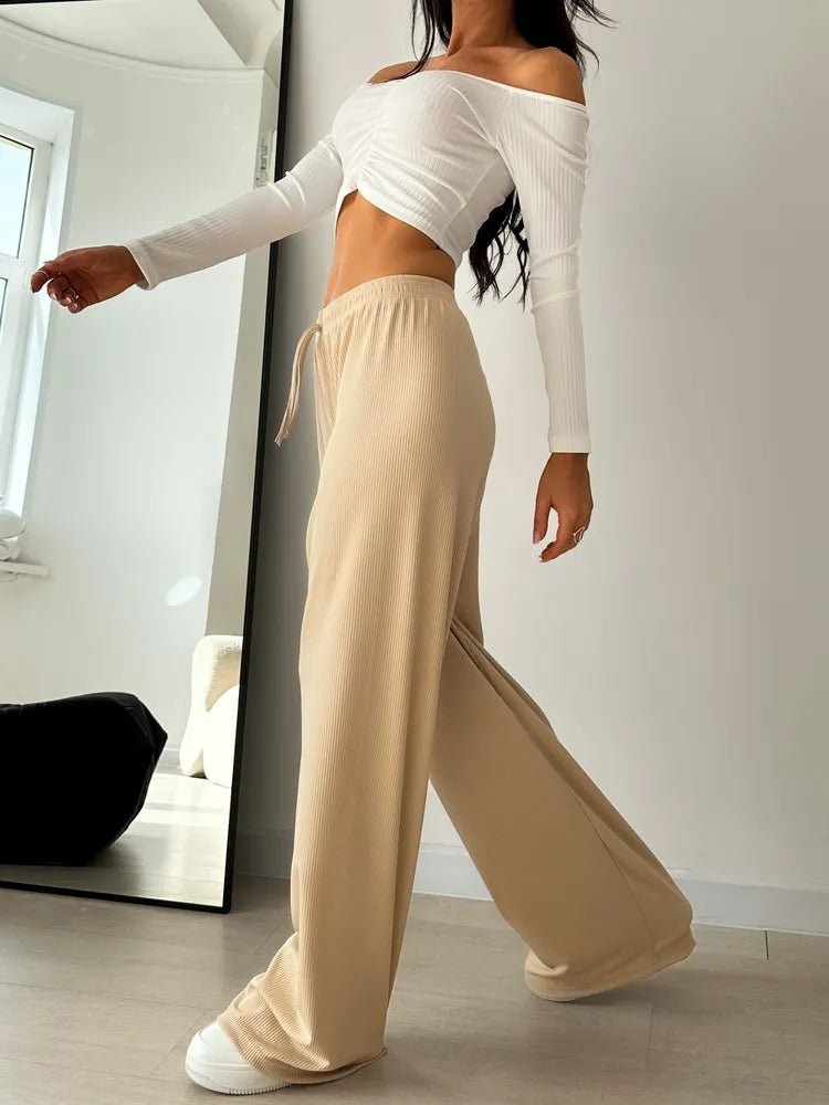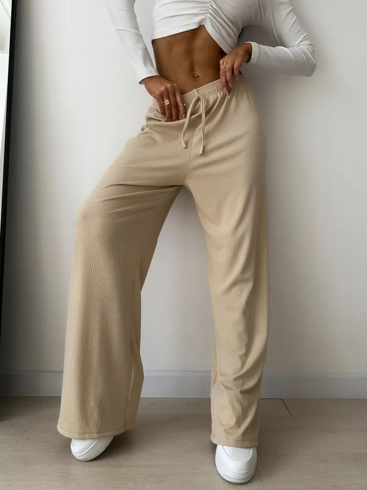 Disse vide ribstrikkede bukser er den perfekte kombination af komfort og stil, der bringer en afslappet elegance til din hverdagsgarderobe. De er designet med en afslappet pasform og har en høj elastisk linning med justerbar snøre for maksimal komfort. Det ribstrikkede stof tilføjer tekstur og interesse, mens det vide ben skaber en afslappende silhuet. Disse bukser er ideelle til weekendafslapning eller som en del af en chic, afslappet look.